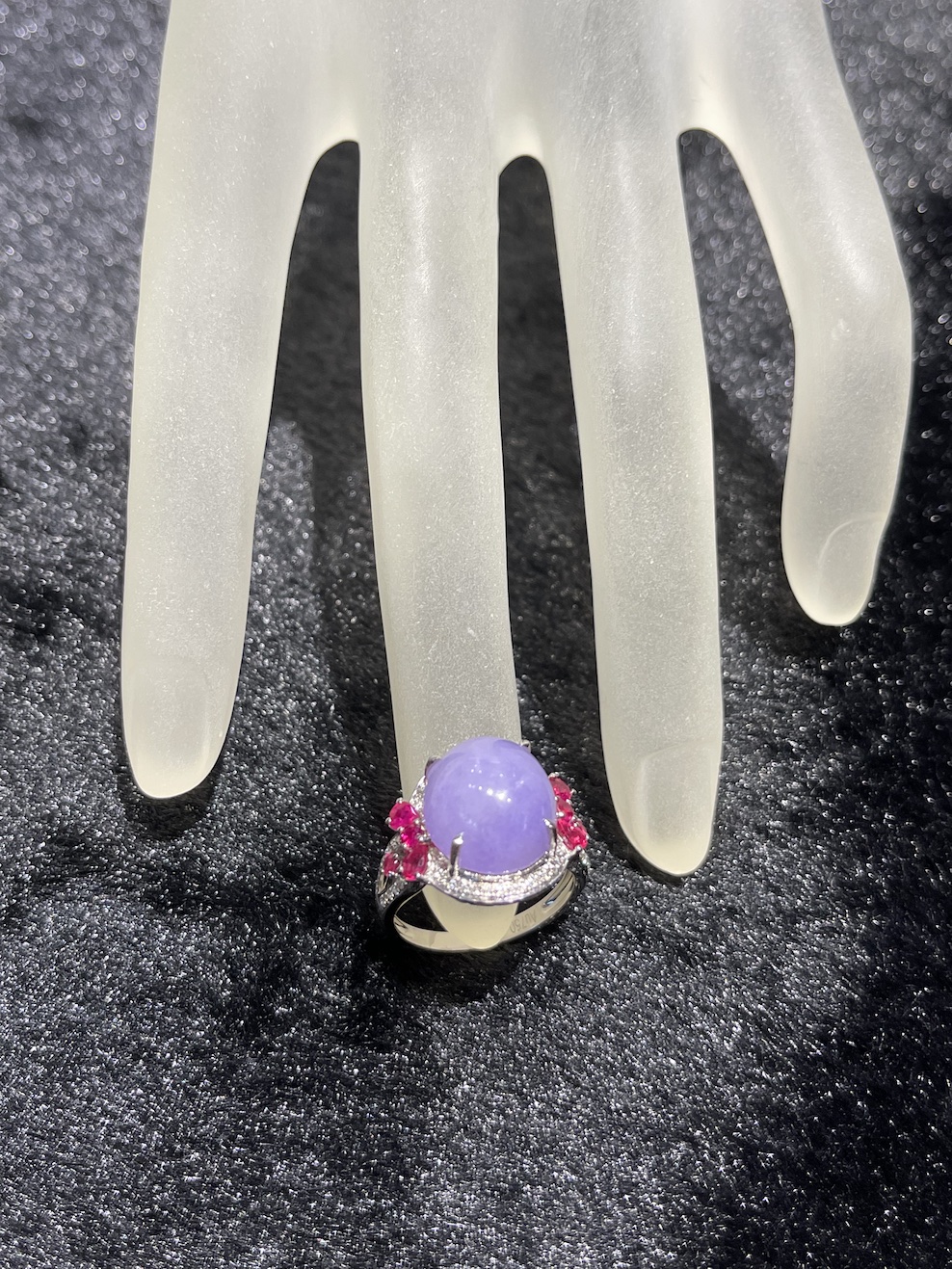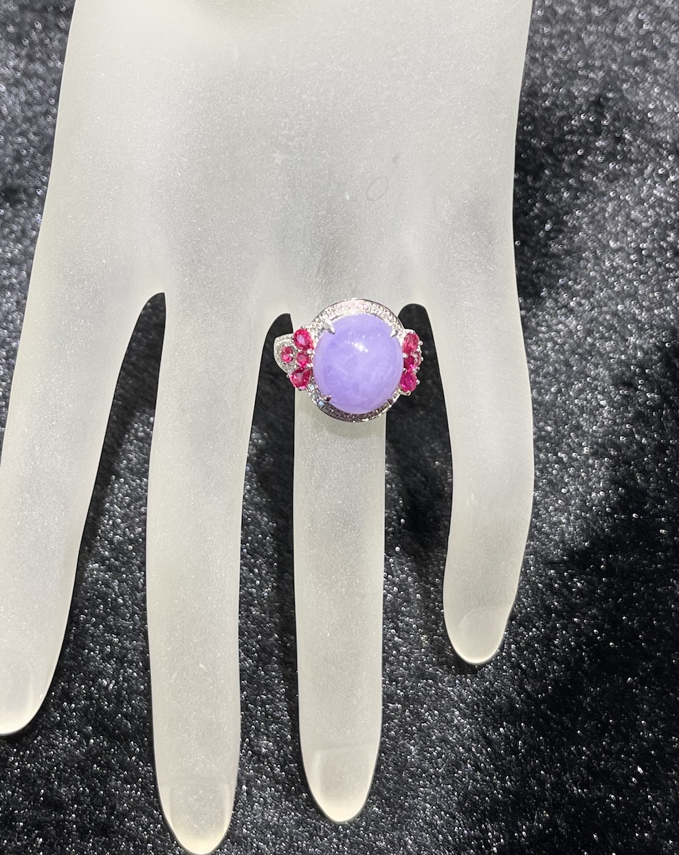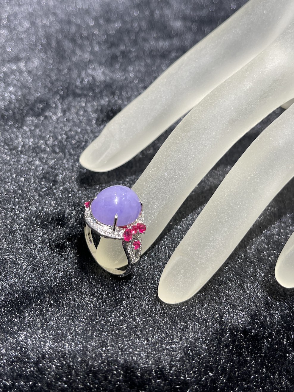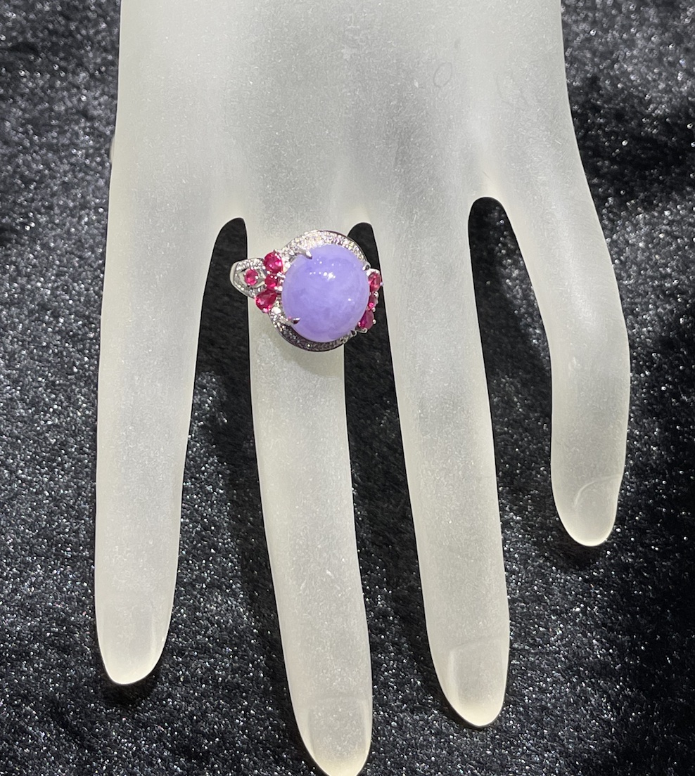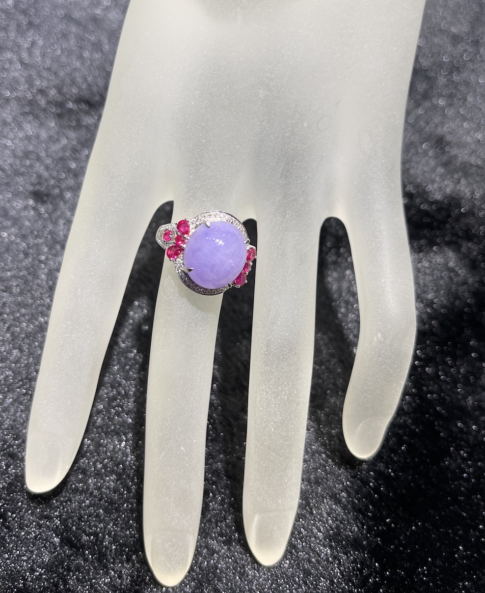 A very beautiful vibrant lavender cabochon is designing into a jade ring. The lavender cabochon has very good translucency and lustre. The setting is in 18k white gold, diamonds and ruby.
