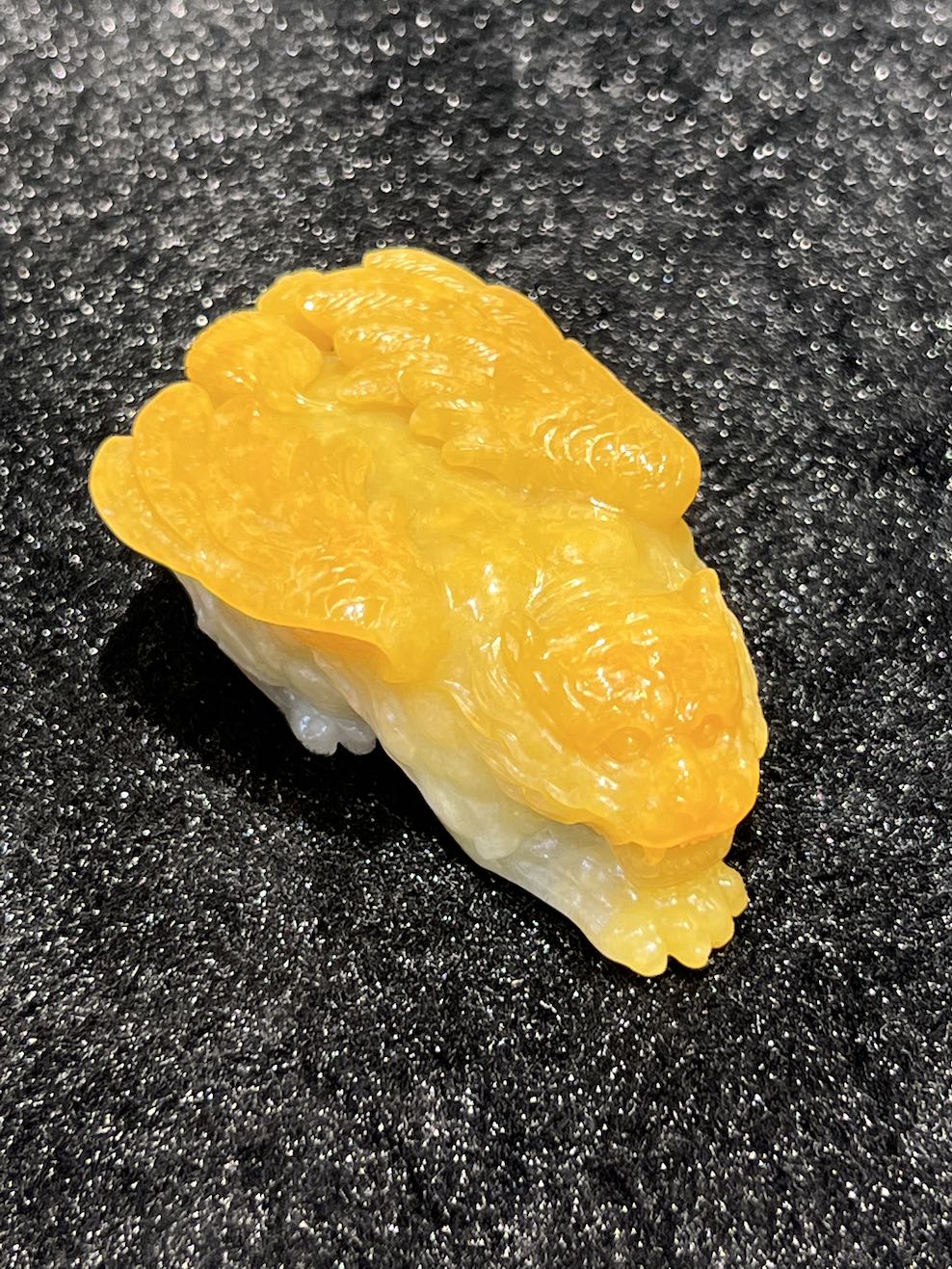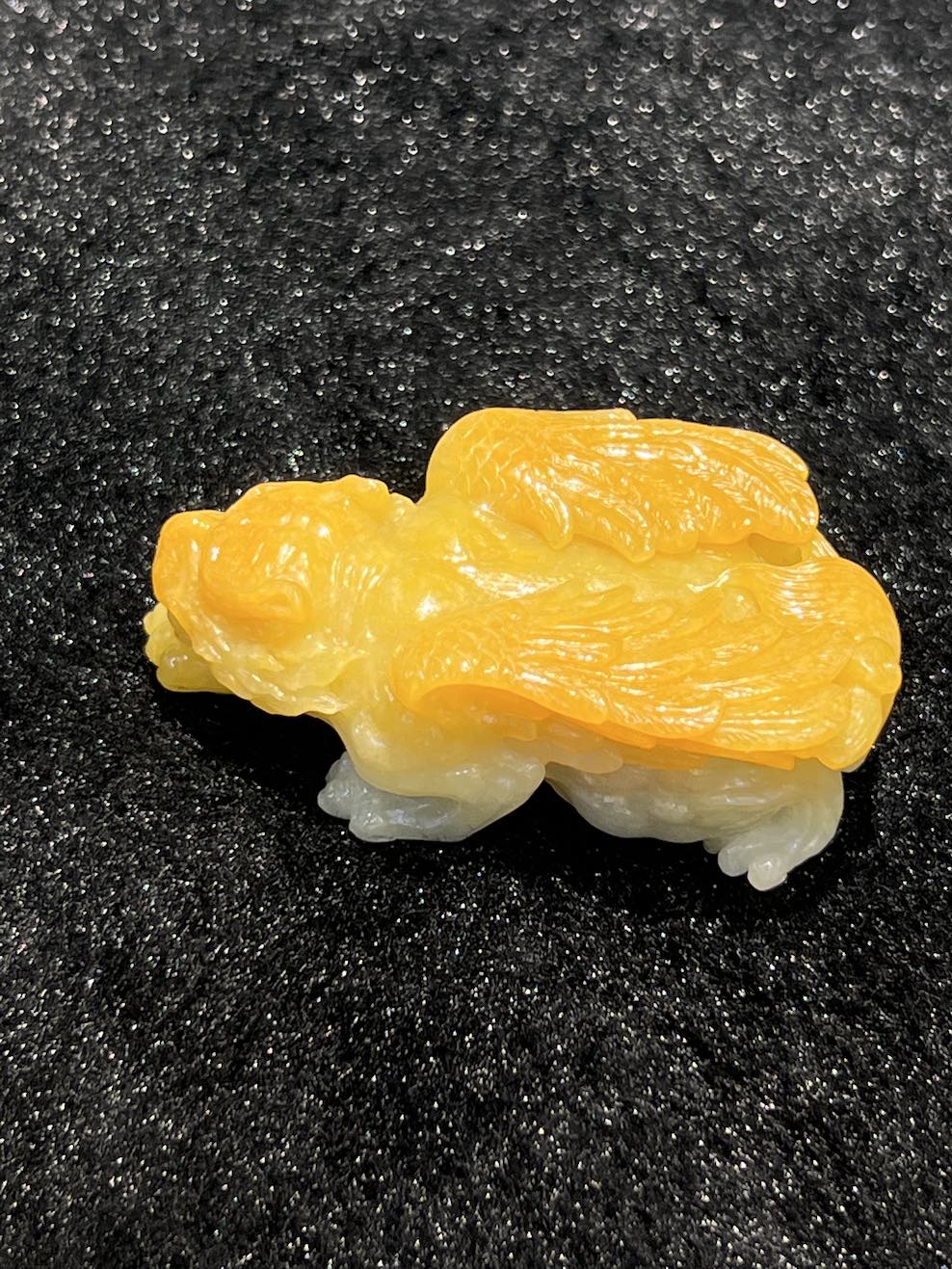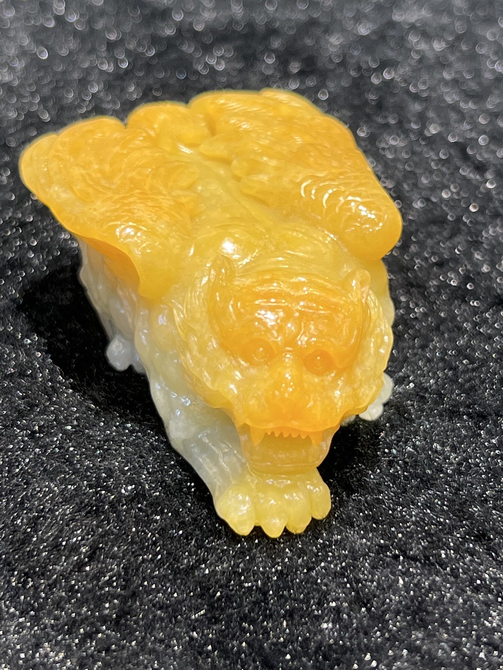 The jade ornament is carving as a tiger with wings. The jade tiger has very vivid honey yellow colour with translucent quality. The jade ornament symbols “如虎添翼” in Chinese.
