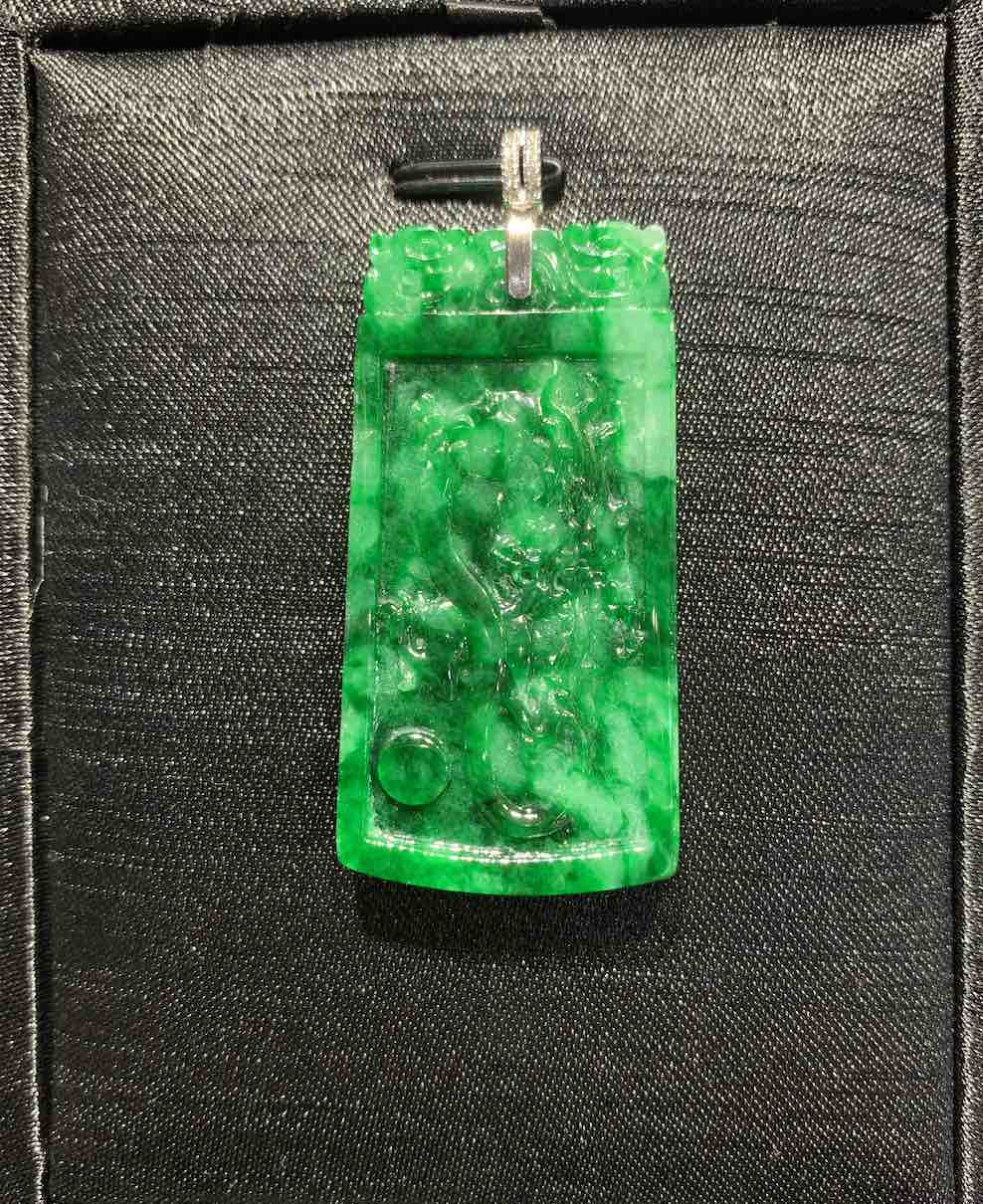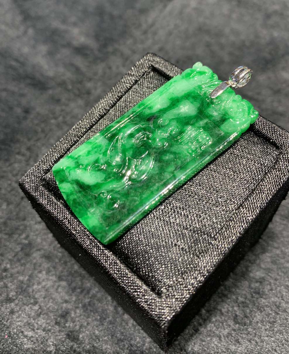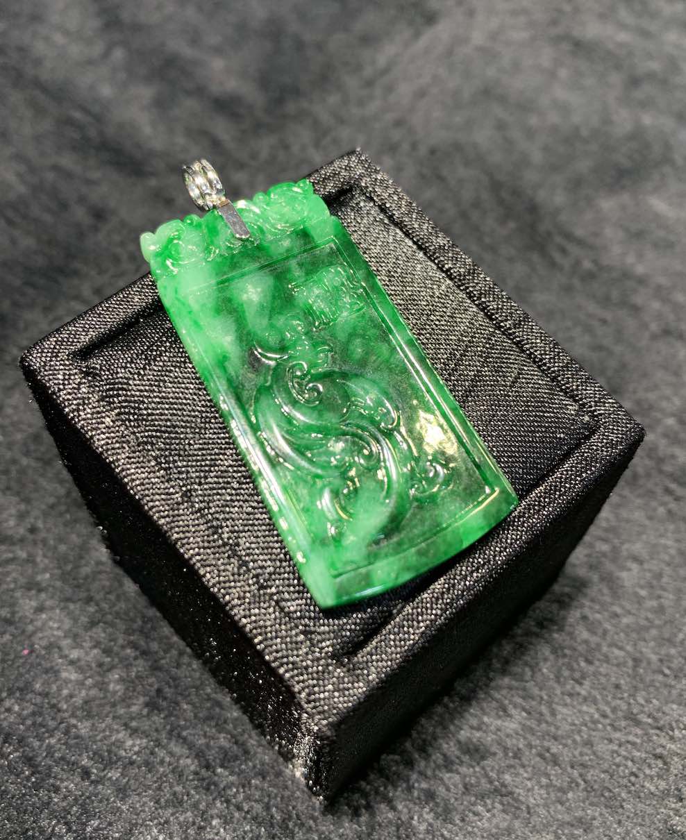 A very vivid old-pit green colour jadeite pendant is carved with dragon and phoenix on its front and back. it has very good and auspicious meaning of “龙凤呈祥” in Chinese.