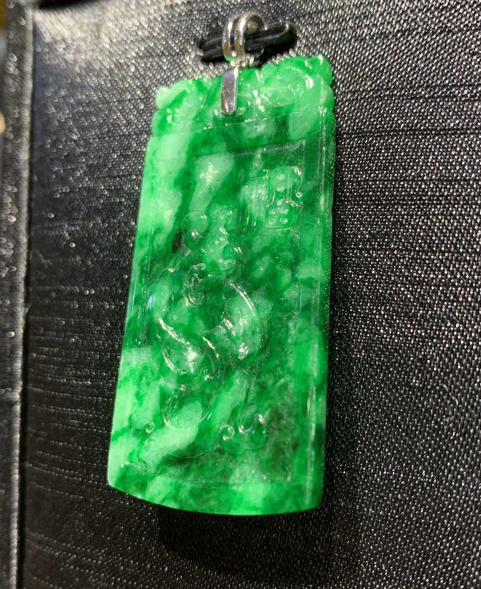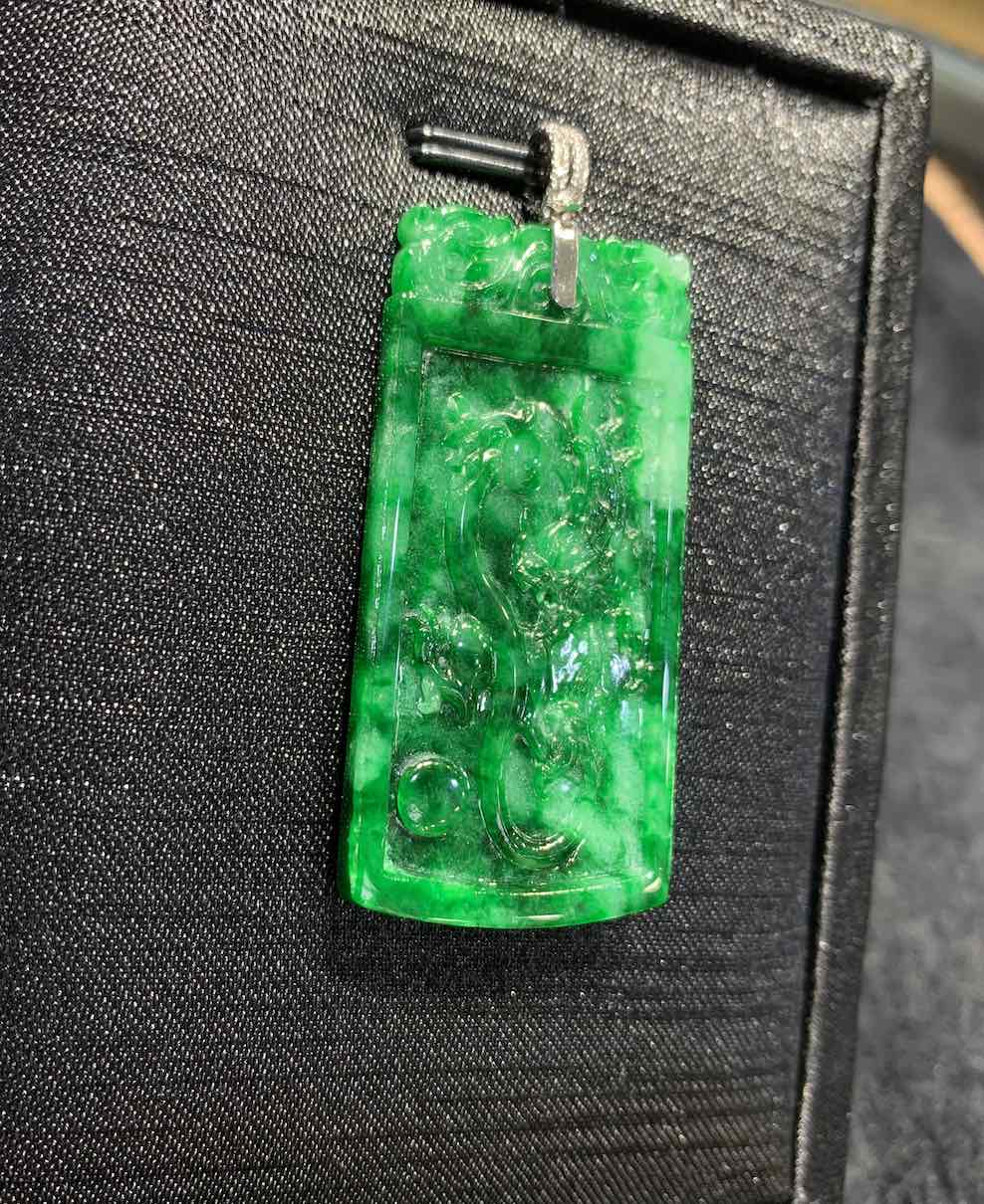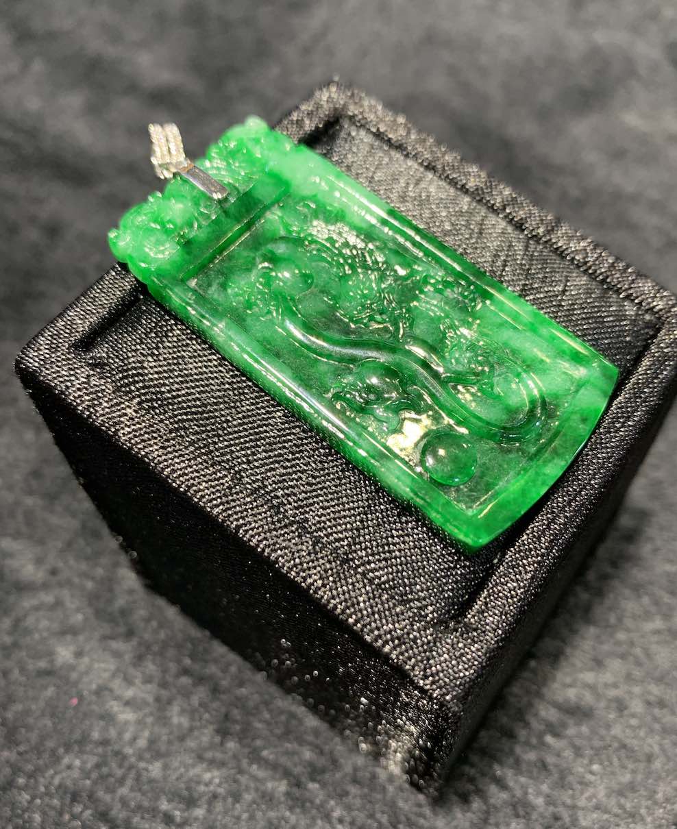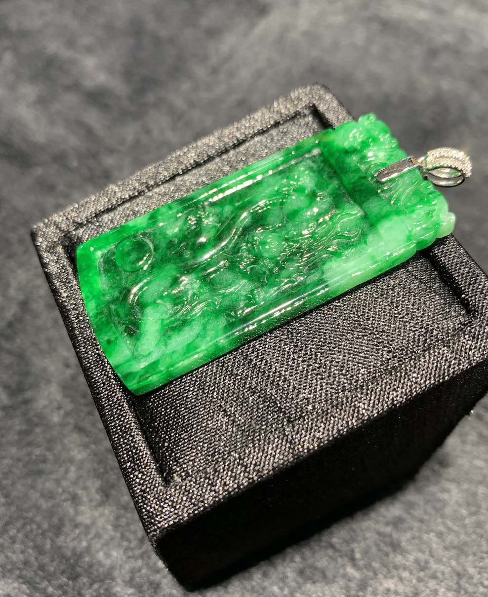A very vivid old-pit green colour jadeite pendant is carved with dragon and phoenix on its front and back. it has very good and auspicious meaning of “龙凤呈祥” in Chinese.