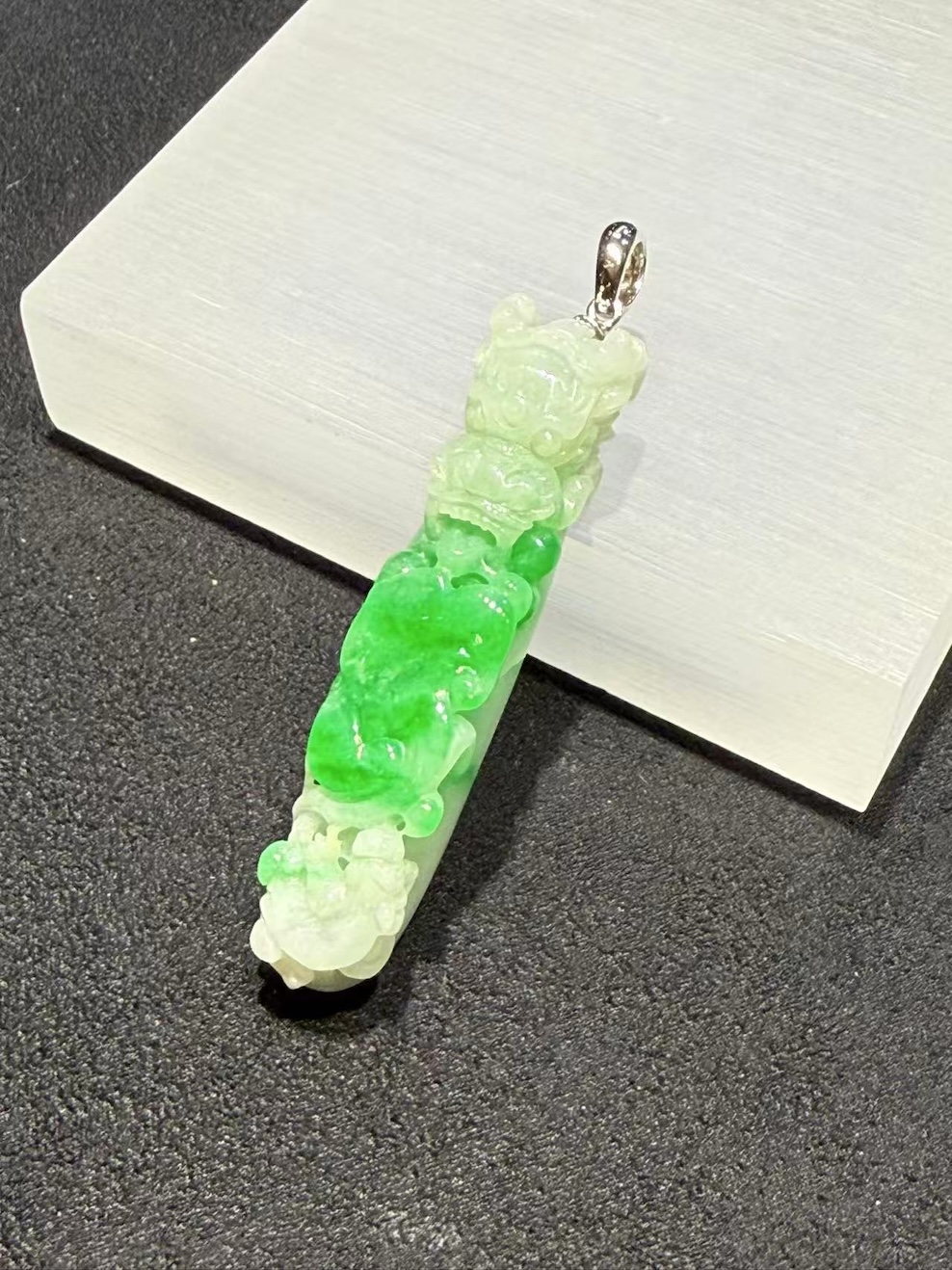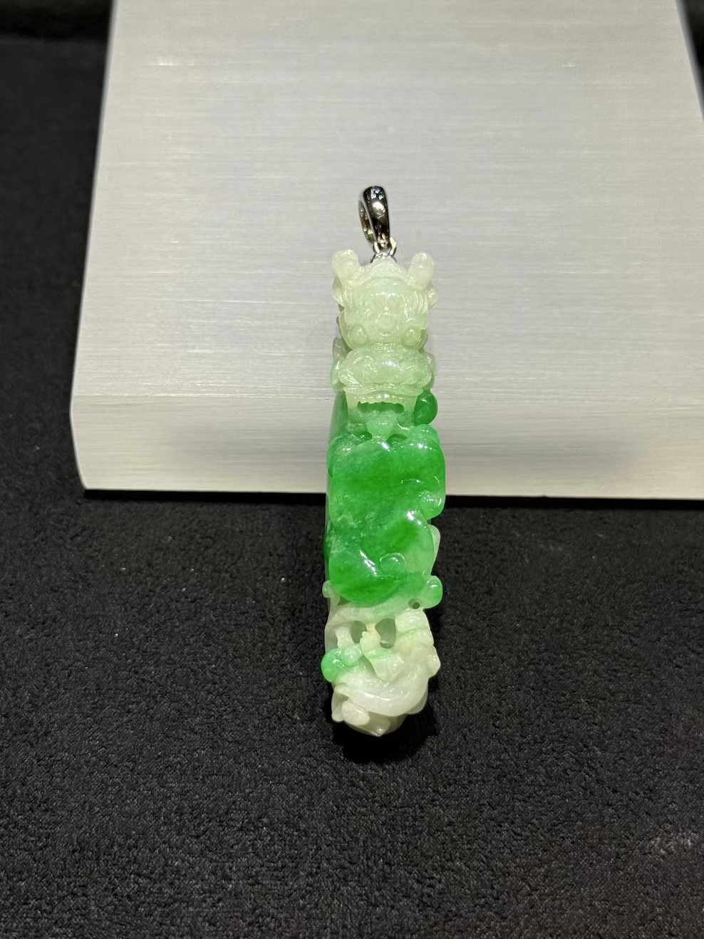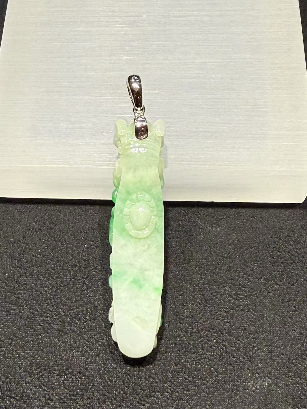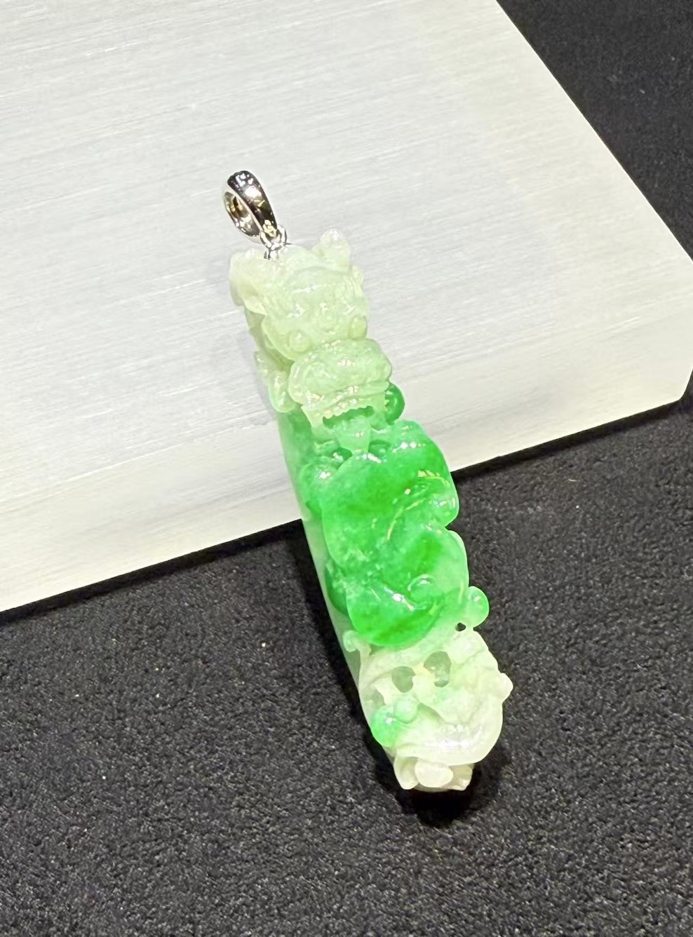 Light moves through the translucent jade and brightens the paler sections. As a result, the pendant shows dimension instead of flat colour. The vivid green area draws immediate attention, while the softer white tones create contrast and clarity. In addition, the smooth polish highlights the carving lines and emphasises the depth of each motif.