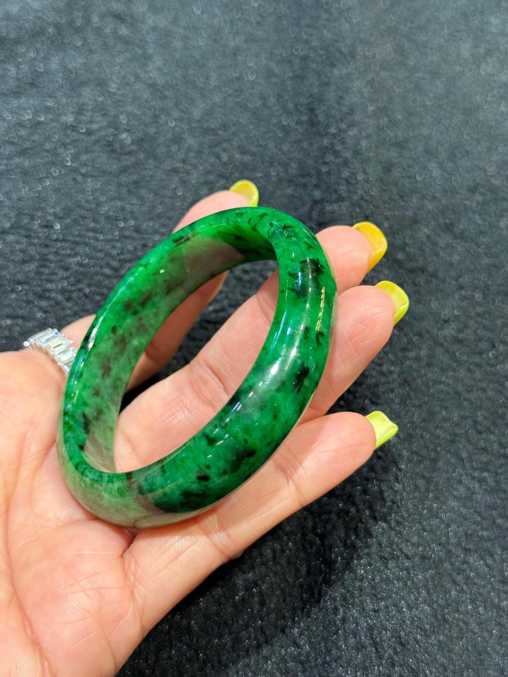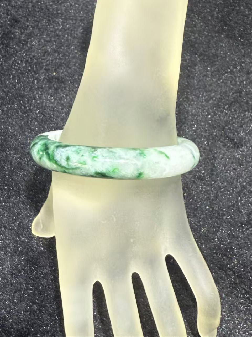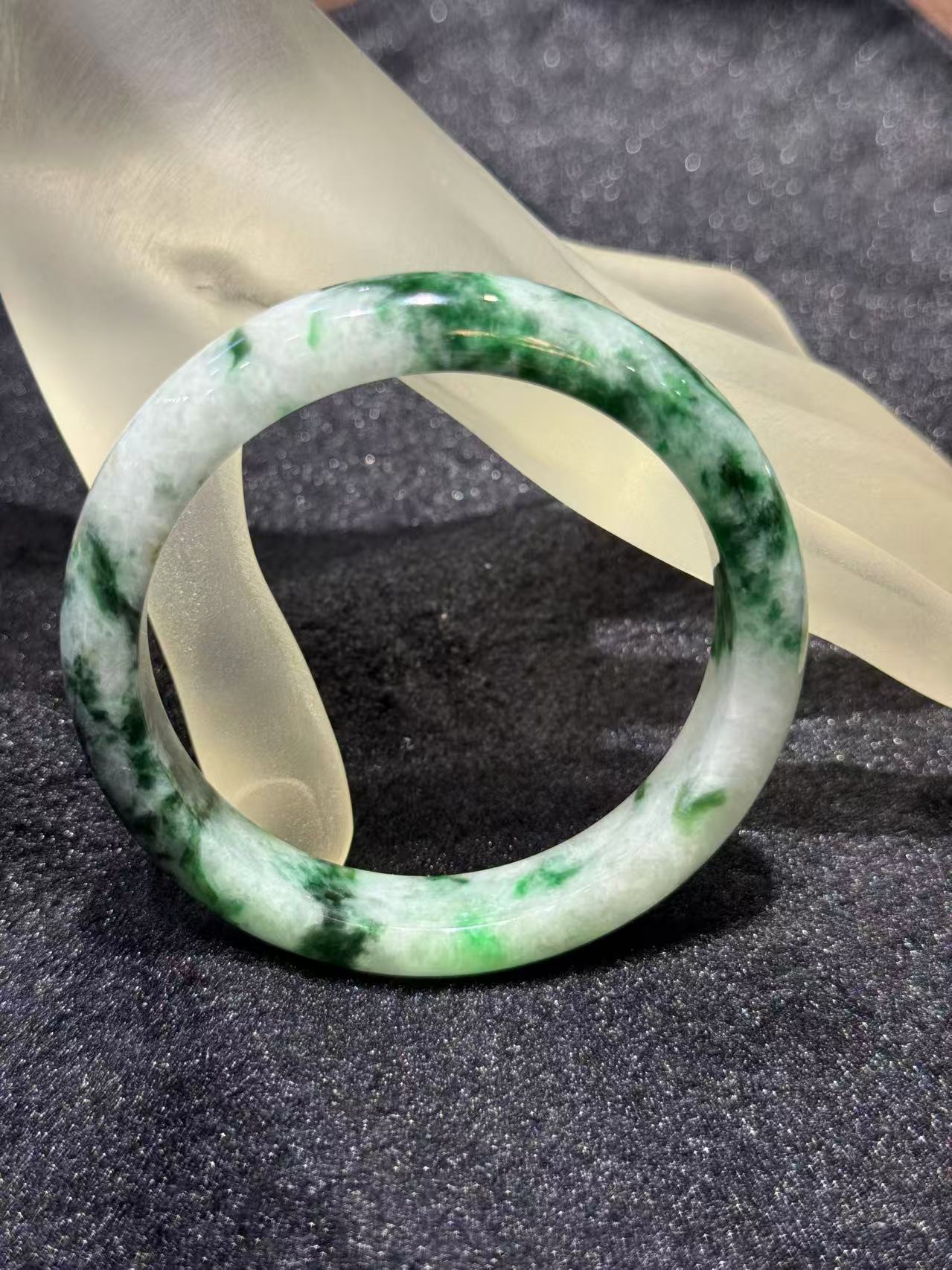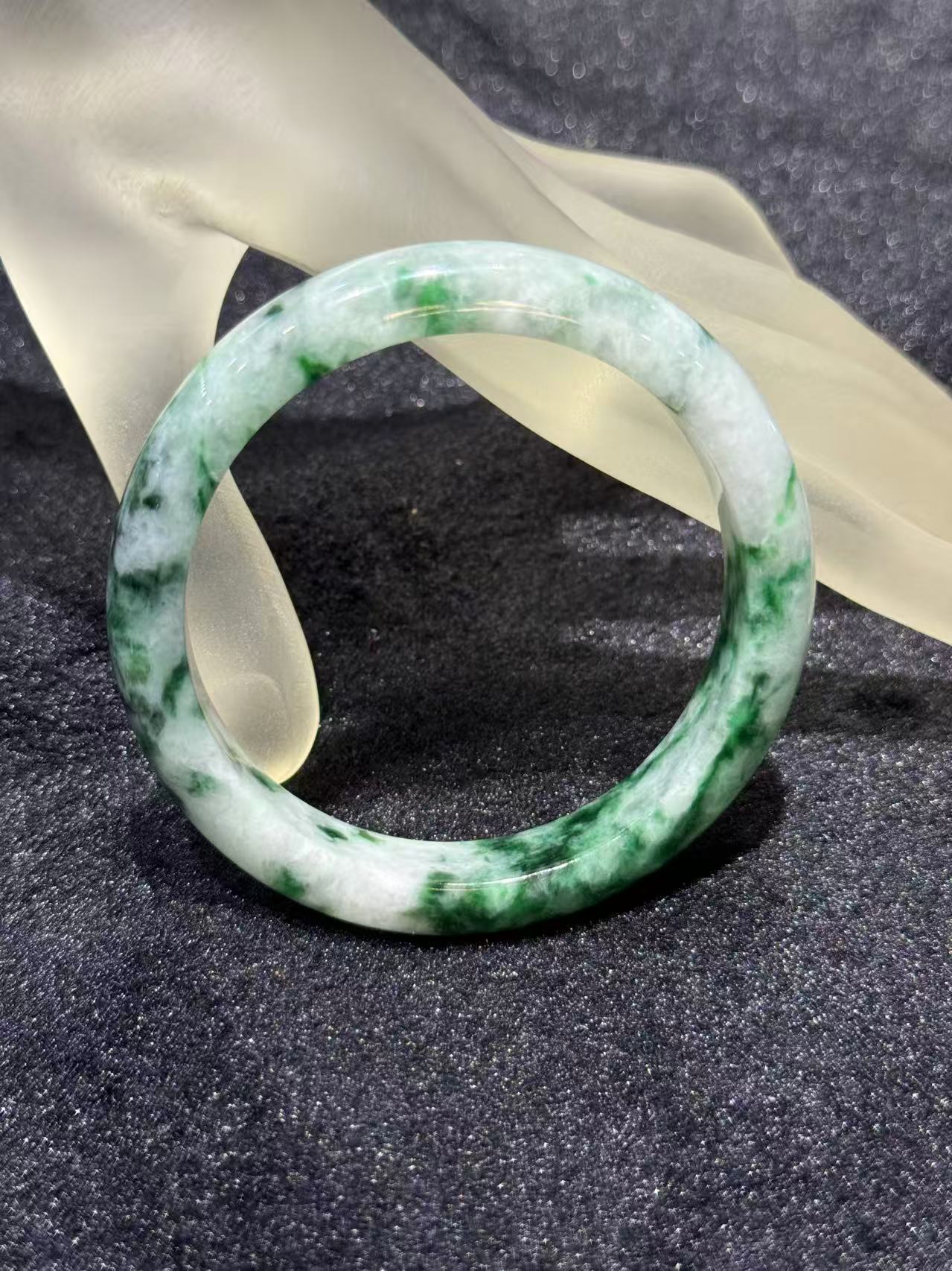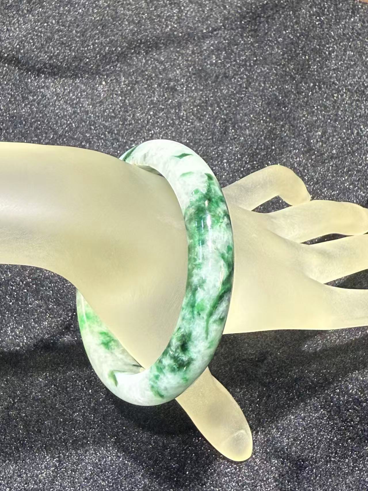 This jadeite bangle features a soothing base tone of icy, translucent white, layered with natural green flows that appear like soft brushstrokes across the stone. The greens vary from light spring tones to deeper forest hues, giving the piece a lively yet balanced character.