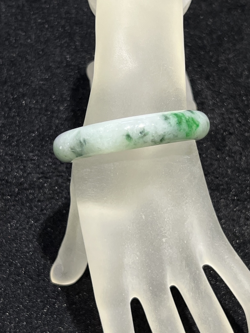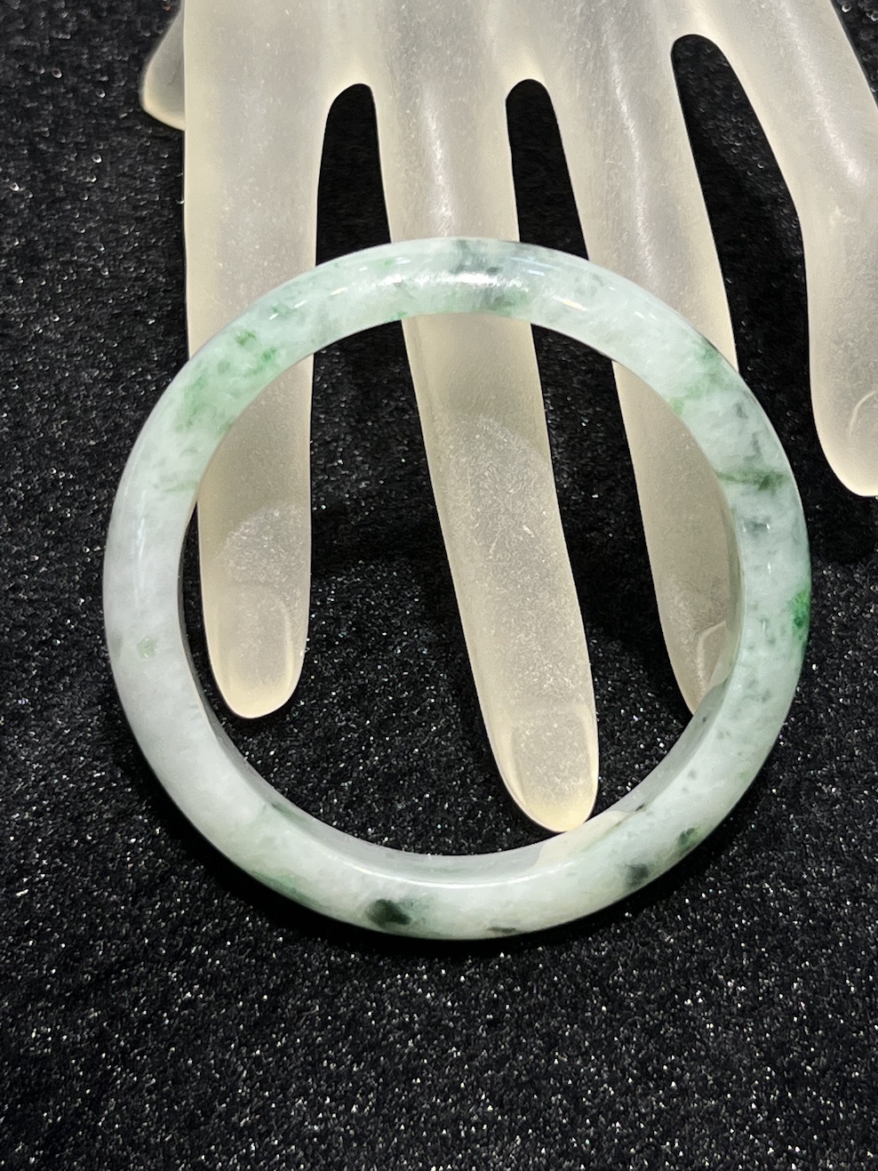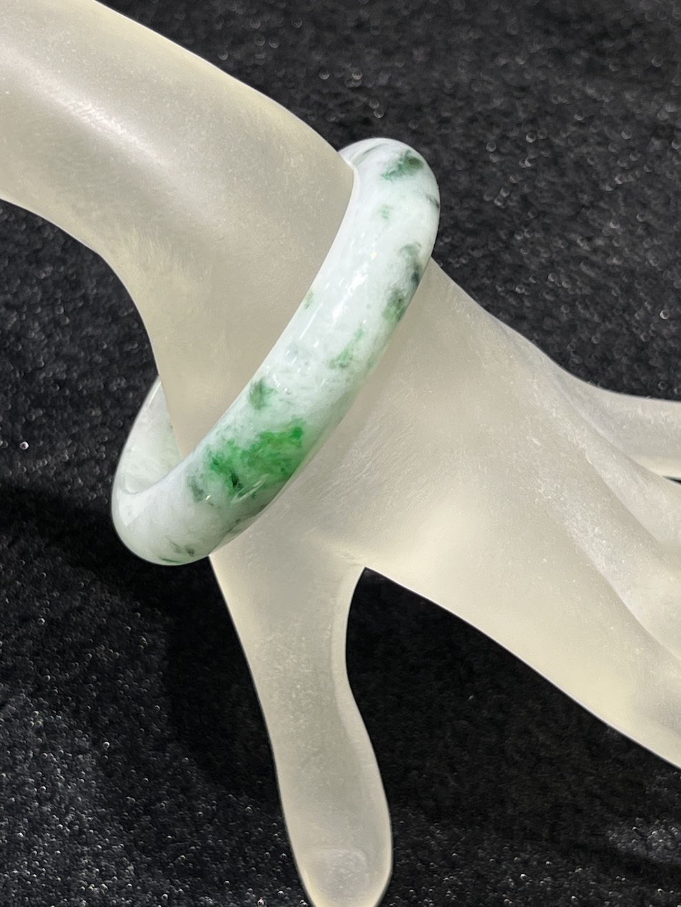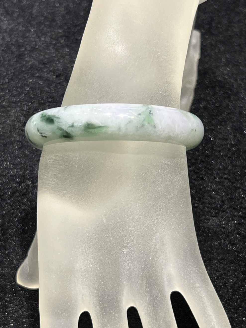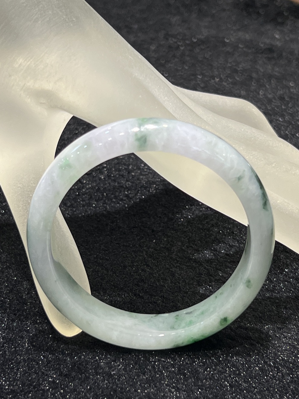 The jade bangle has whiteish base colour with some patches of faint green on it. The texture of the jade bangle is translucent.