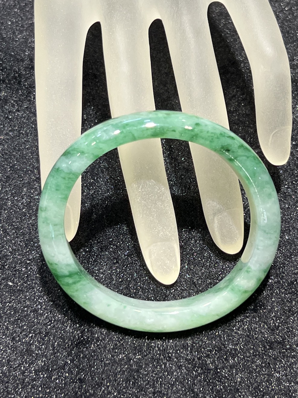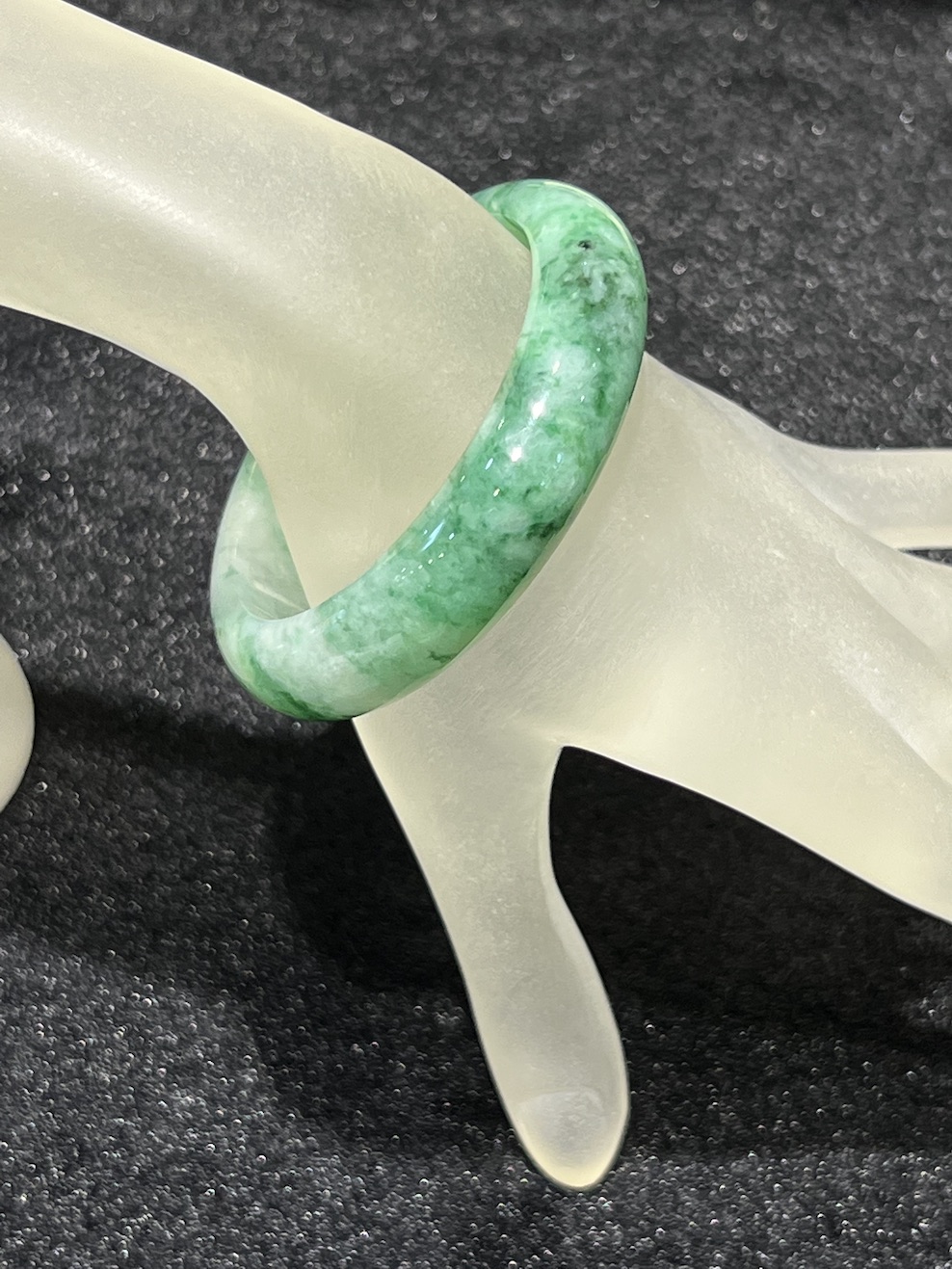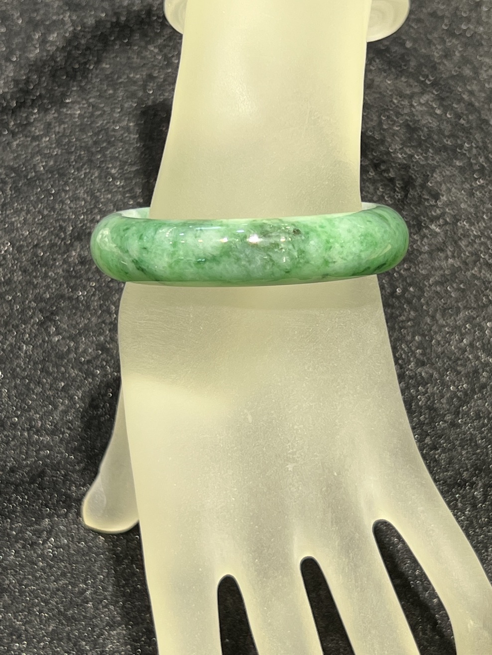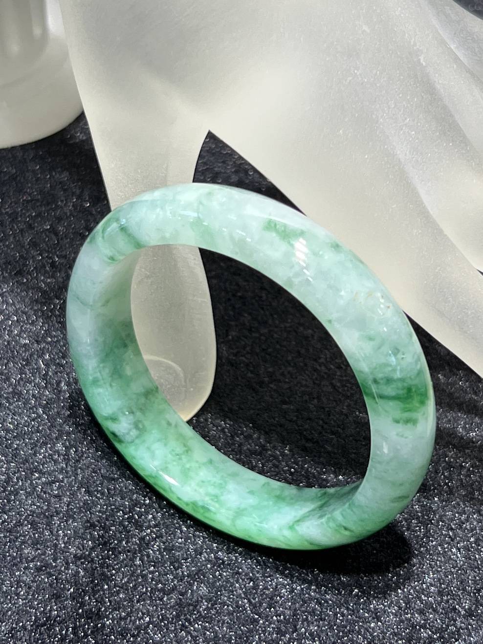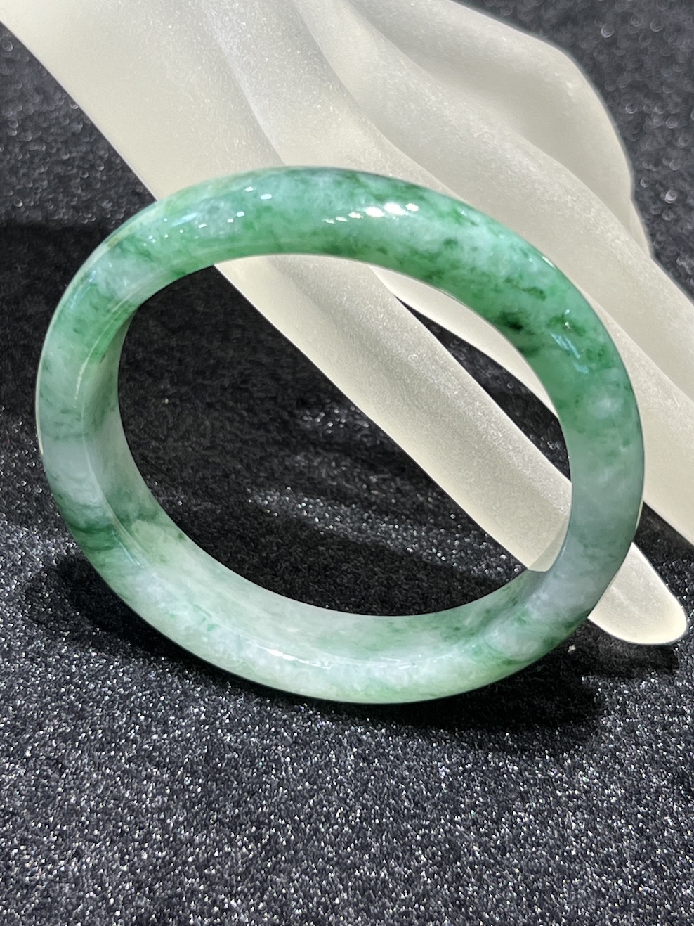 The jade bangle has patches of faint green and dark green. The jade bangle is translucent and is in oval shape.