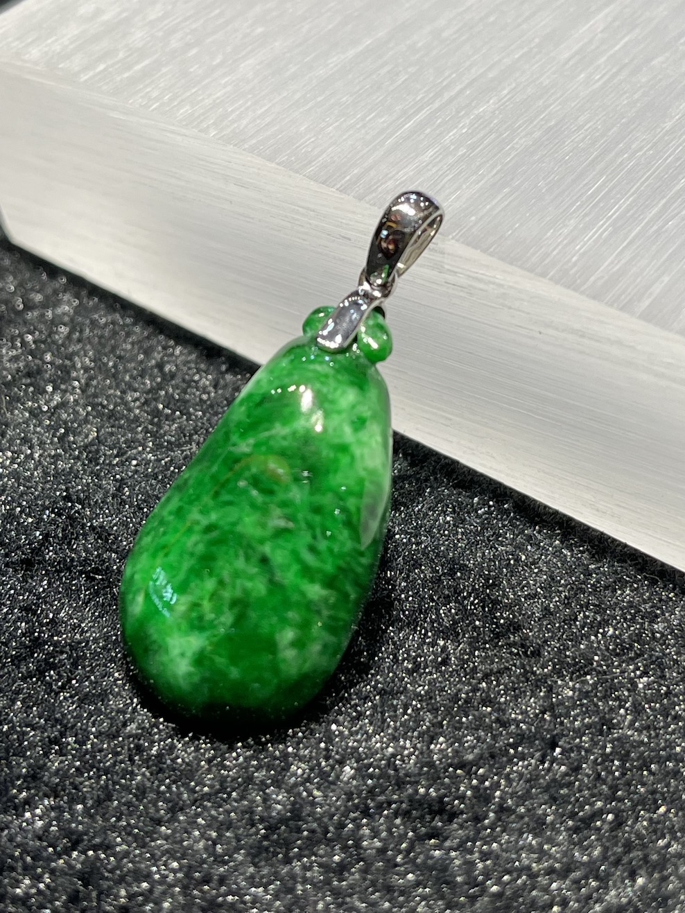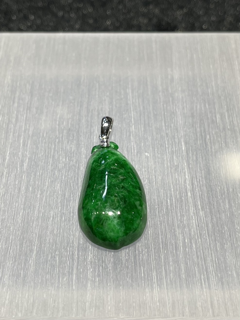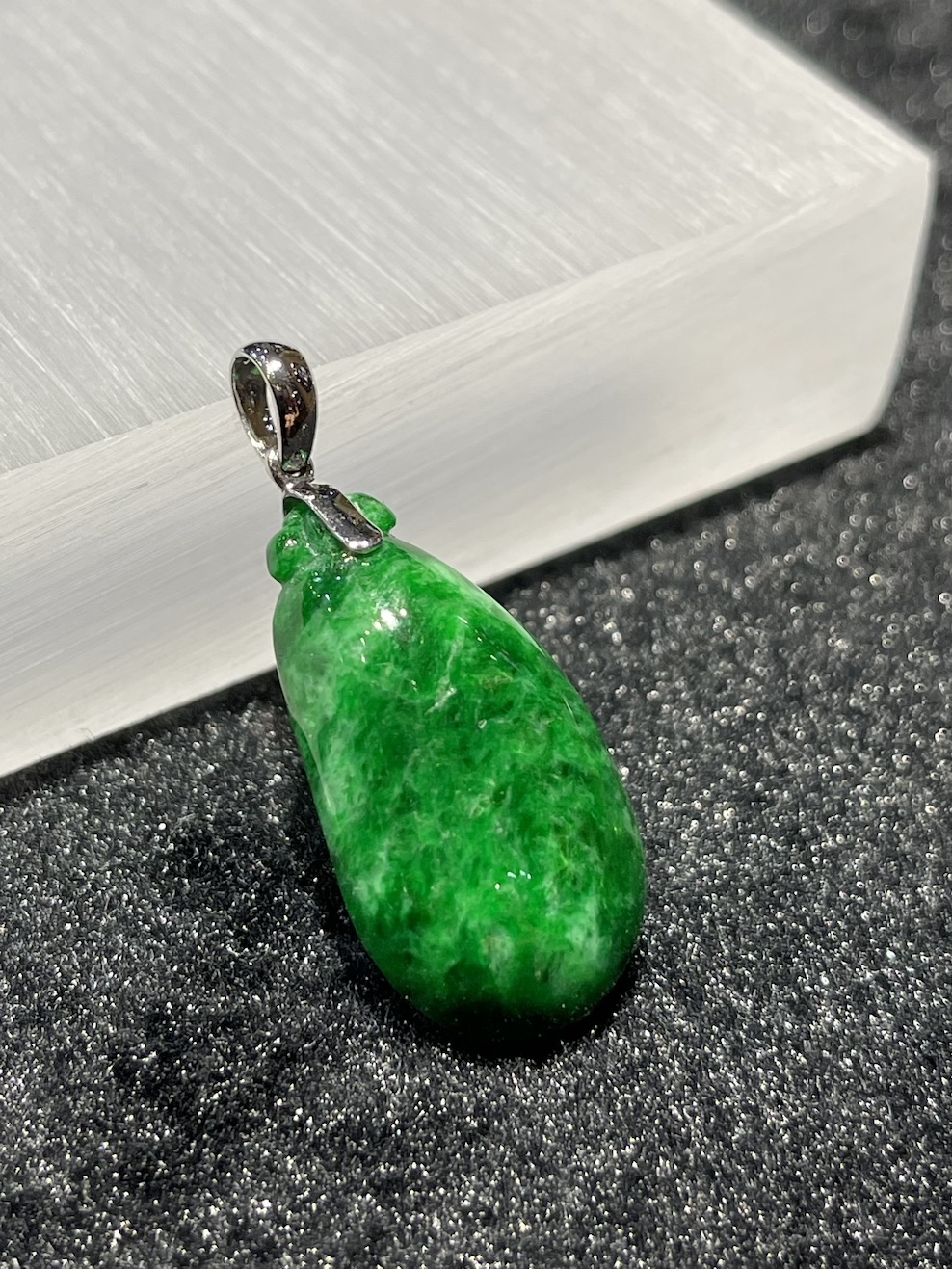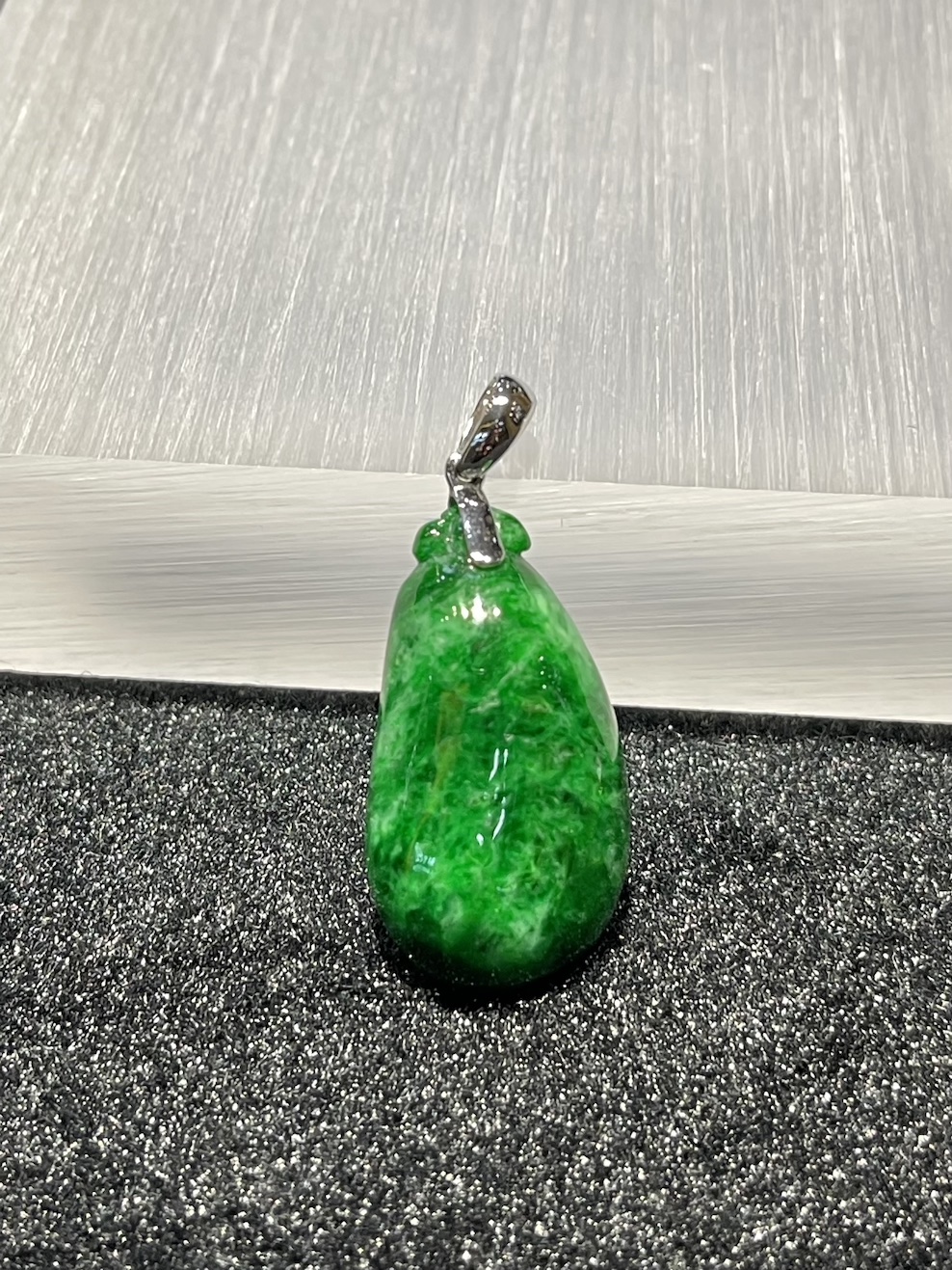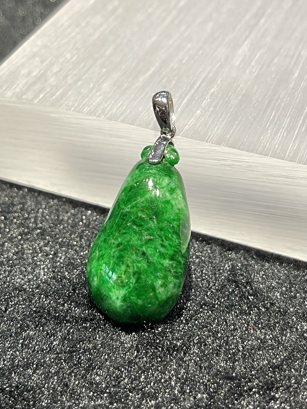 a vivid old-pit green jade pendant is polished and shaped into a fruit design with 18k white clasp. A fruit designed jadeite pendant symbolise a fruitful prosperity ahead.